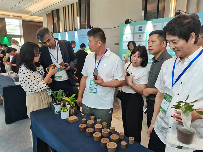 ▲在中節(jié)能鐵漢展臺,參加大會的中外嘉賓詳細了解“土非土”基質技術特點