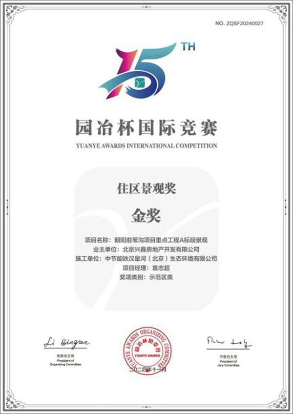 近日,第十五屆園冶杯國(guó)際競(jìng)賽評(píng)審結(jié)果出爐,中節(jié)能鐵漢所屬鐵漢星河承建的朝陽(yáng)前葦溝項(xiàng)目重點(diǎn)工程A標(biāo)段景觀項(xiàng)目(中建璞園示范區(qū))獲得住區(qū)景觀獎(jiǎng)示范區(qū)類金獎(jiǎng)。
